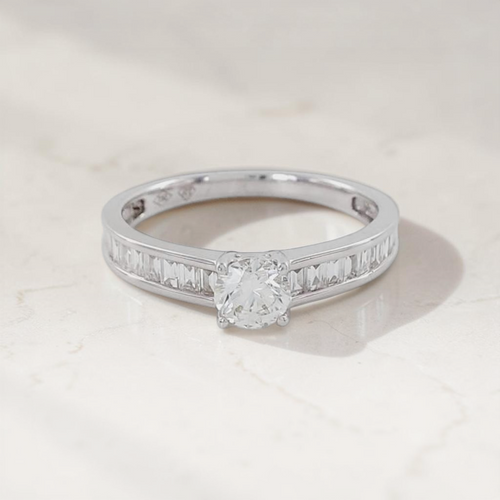 Anillo de Compromiso Brillante y Baguettes en Oro Blanco